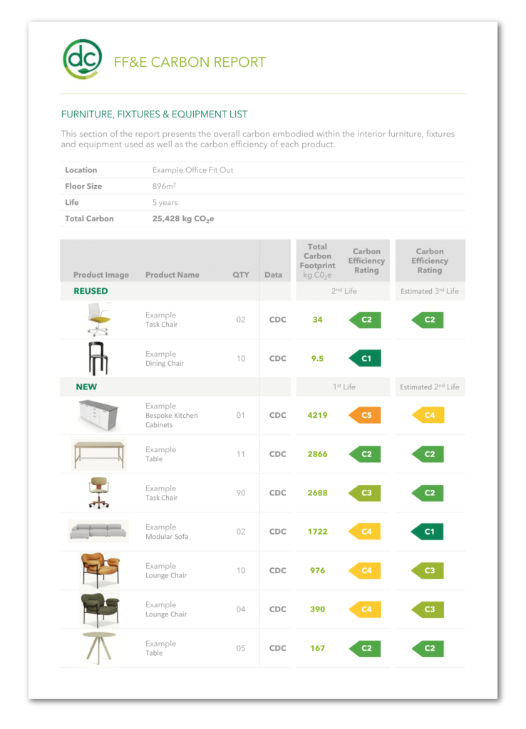 Intricate carbon breakdown of the supplied FF&E information, including; product images, data types, total carbon footprint, and carbon efficiency rating for both 1st & 2nd life of the products included.