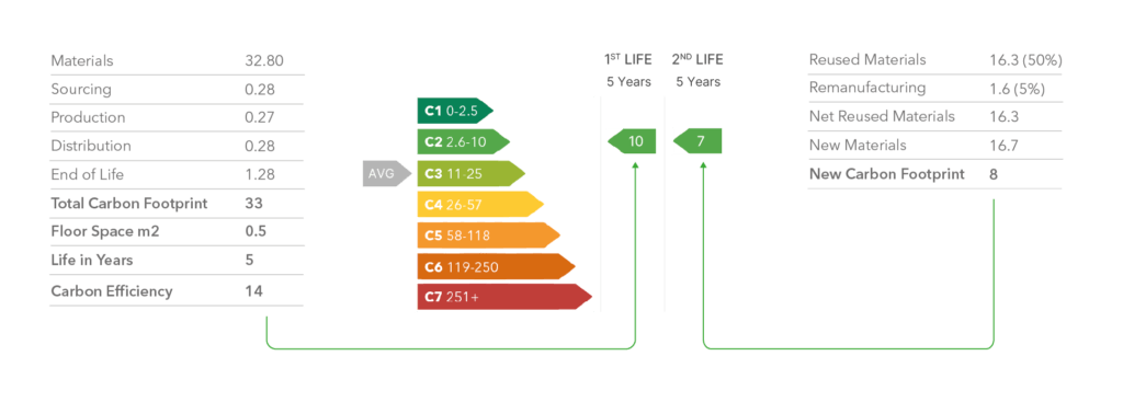 All products are given a carbon efficiency rating. This is calculated by dividing the total cradle-to-grave carbon footprint, by the square meterage, by design life (in this example, 5 years). This calculation allows dc to compare different product types and determine an average carbon footprint by product catagory.